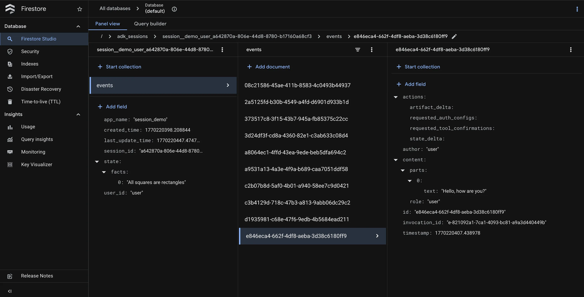 If we navigate to our Firestore collection in the Google Cloud console, we can see our adk_sessions collection, with metadata stored in documents and the events stored as a sub-collection.