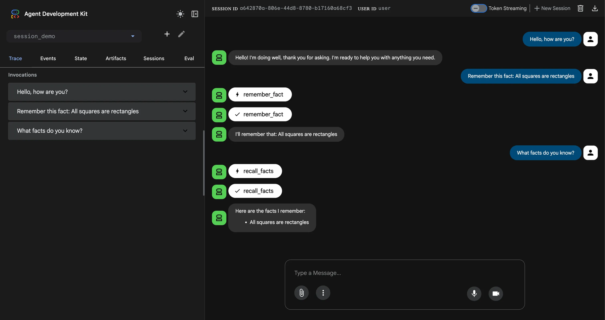 Visit the local application at http://127.0.0.1:8000 and choose session_demo from the agent dropdown and begin chatting with your agent. It has three tool functions to demonstrate its ability to persist memories: remember_fact, recall_facts , clear_facts .